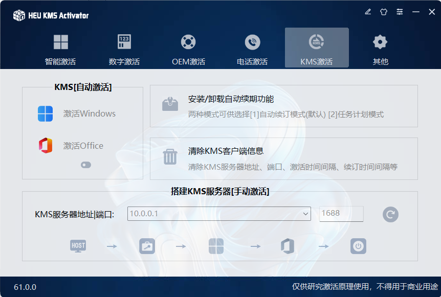 • 搭建KMS服务器[手动激活]:KMS服务器地址/端口