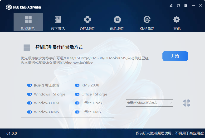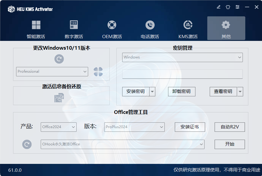 此工具旨在提供一个安全、高效的激活方式,适用于个人和技术研究使用,强烈建议正版用户使用。发布此工具的目的不是为了支持盗版,而是为了让用户能够测试和了解激活的技术细节。请用户理解和正确使用此工具,开发者不鼓励任何形式的非法软件使用。