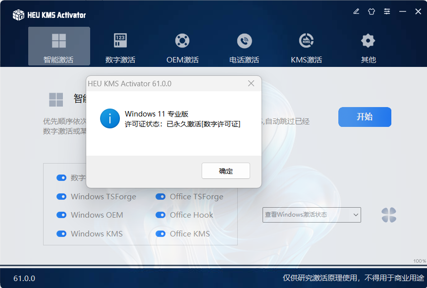 点击主界面的橘黄色按钮,系统会智能判断并执行最合适的激活方式。如果系统检测到Windows或Office已经永久激活,它会自动跳过激活过程。