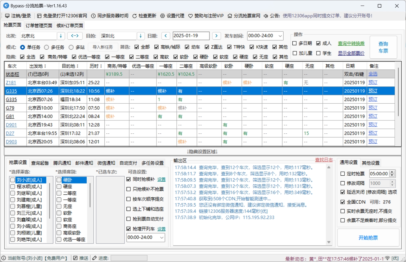 bypass分流抢票(详情请戳 官网)是一款免费无广适用于PC端的自动分流抢票软件,采用.net 4.5.2框架开发,完全跟进官方。其支持全程自动抢票、自动抢候补、自动识别验证码、多线程秒单、稳定捡漏、QQ/微信消息通知提醒,支持多日期、多车次、多席别、多乘客等功能,但视具体情况而定。