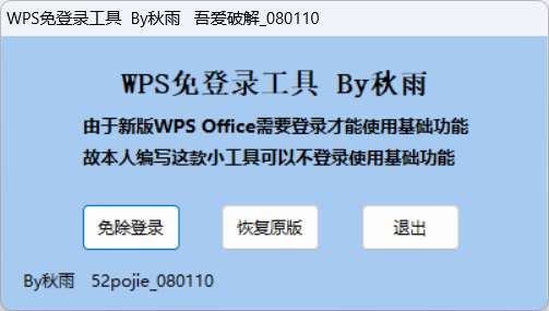 由于新版WPS OFFICE 需要登陆后才可以使用基础功能,所以编写此软件来免登录就可以使用WPS OFFICE基础功能