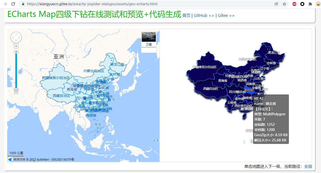 在线预览地址:https://xiangyuecn.gitee.io/areacity-jsspider-statsgov/assets/geo-echarts.html (提供了ECharts + 高德地图四级下钻代码)