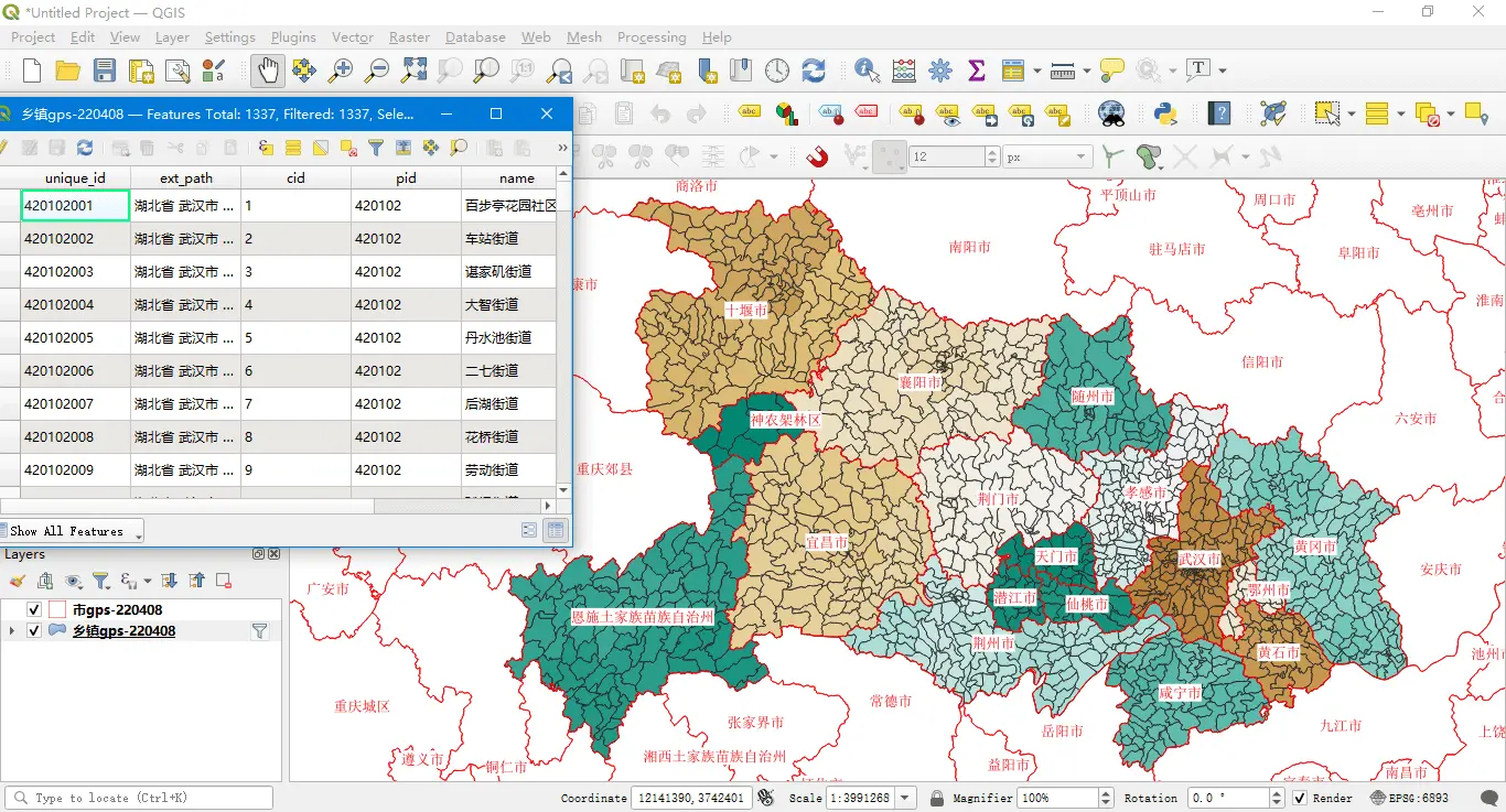 湖北省市和乡镇(QGIS Mercator投影):